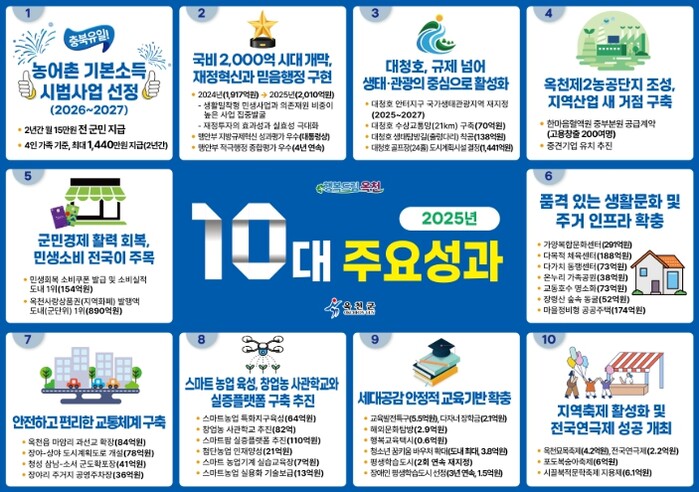 황규철 군수는 “올해의 군정 10대 주요 성과는 군민과 행정이 함께 쌓아 온 노력의 결과물”이라며 “앞으로도 옥천군은 군민 중심의 행정을 바탕으로 지속 가능한 발전을 위해 노력하겠다”고 밝혔다.