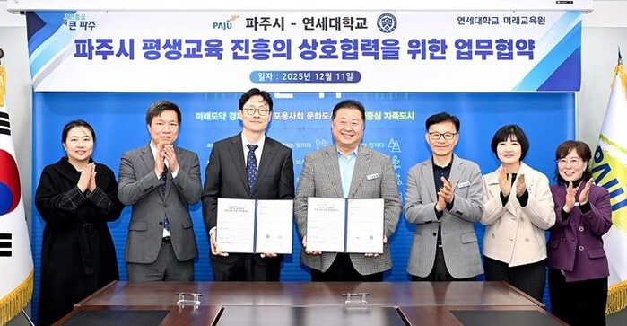 이날 협약식에서 오석영 연세대학교 미래교육원장은 “연세대학교 미래교육원은 지역사회와 함께하는 평생교육을 꾸준히 실천해 왔다”라며 “이번 협약을 통해 파주 시민에게 실질적이고 의미 있는 학습 기회를 제공하고, 대학이 가진 지식과 인적 자원을 나눔으로써 사회적 책임도 함께 실천하겠다”라고 말했다.