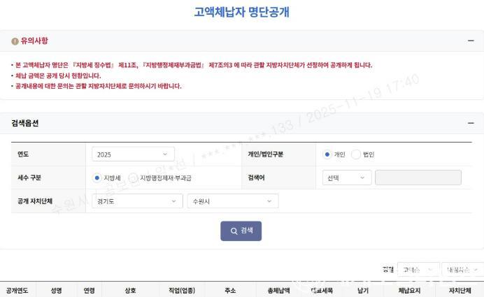 고액·상습체납자 명단은 수원시 홈페이지'분야별정보'세금'정보마당'‘고액 상습체납자 공개’ 게시판에서 확인할 수 있다.