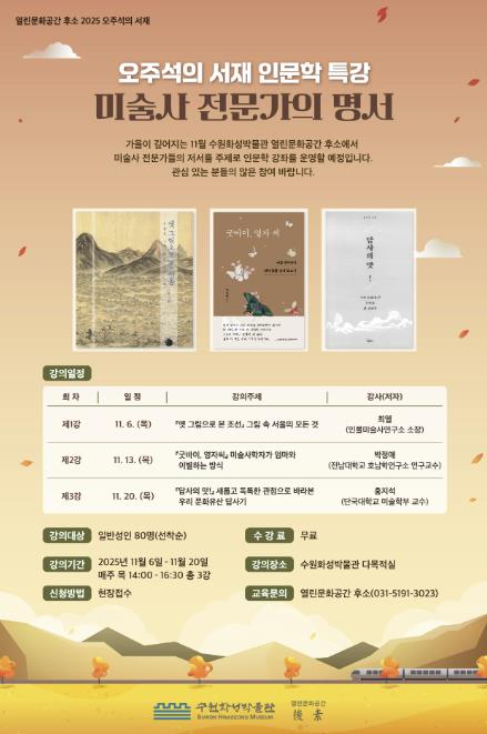 미술사 분야 도서 저자 3인이 강연한다. 11월 6일 '옛 그림으로 본 서울'의 저자 최열 인물미술사연구소장이 ‘조선시대 풍경화 속 서울 해석’을 주제로, 11월 13일에는 '굿바이, 영자씨'의 저자 박정애 전남대학교 호남학연구소 연구교수가 ‘미술사학자의 삶과 이별 이야기’를 주제로 강의한다.