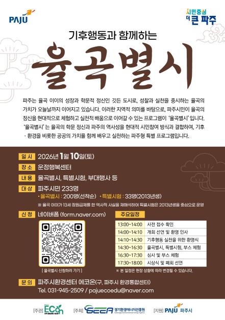 행사의 핵심 프로그램인 ‘별시’는 ▲기후위기·탄소중립·자원순환 등 기초 개념을 맞힘·틀림(OX) 문제로 풀어보는 ‘초시’, ▲율곡 이이의 핵심 사상을 기후 대응 가치로 해석해 보는 ‘복시’, 그리고 ▲기후행동 실천 의지를 선언하는 ‘전시’로 구성된다. 이와 함께 13세 청소년을 대상으로 한 특별시험(소과)도 별도로 진행된다. 율곡 이이가 13세에 장원급제한 역사적 사실에서 착안한 프로그램으로, 청소년들이 스스로 기후 인식과 실천 의지를 표현해 보는 기회를 제공할 계획이다.