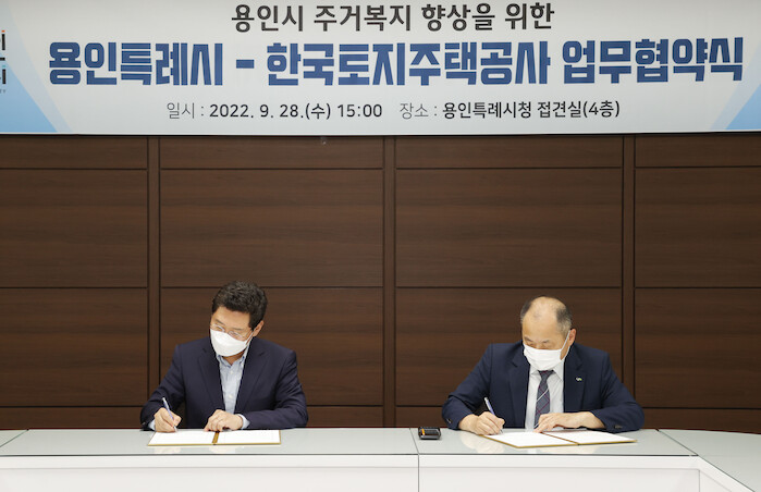 | ▲ 이상일 용인시장과 권세연 LH 경기지역본부장이 용인시 주거복지 향상을 위한 협약서에 서명을 하고 있다.(사진=용인시) |