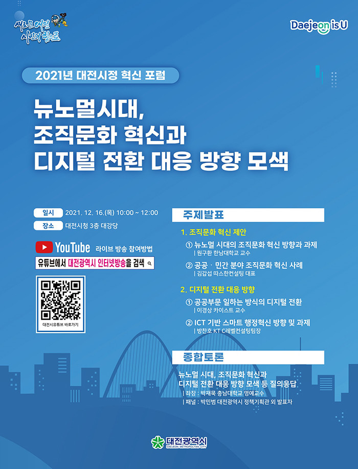[세계로컬타임즈 민순혜 기자] 대전시는 16일 대전시청 대강당에서 ‘2021년 대전시정 혁신 포럼’을 개최했다. 이번 포럼은 뉴노멀 시대, 새로운 조직문화 정립과 일하는 방식의 디지털 전환 대응 방향을 모색하고자 기획됐다.