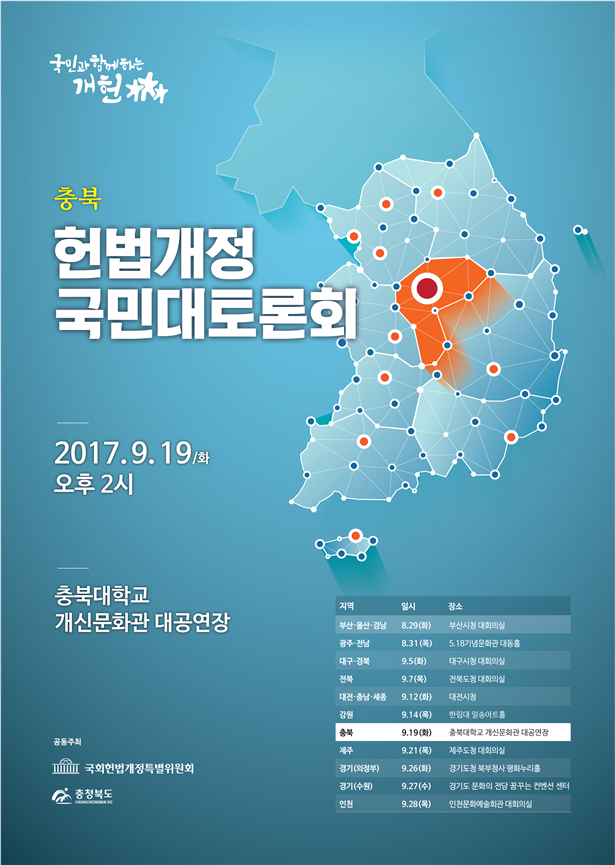 [세계로컬신문 유영재 기자] 국회헌법개정특별위원회(위원장 이주영)와 충청북도(도지사 이시종)가 공동으로 주최하는 '헌법개정 국민대토론회'가 오는 19일 오후 2시에 충북대학교 개신문화관 1층 대공연장에서 열린다.