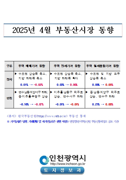 인천시가 한국부동산원의 부동산 통계정보를 분석해 발표한 ‘2025년 4월 부동산시장 동향 보고서’에 따르면, 4월 인천의 주택 매매가격지수 변동률은 전월 –0.16%에서 –0.07%로 나타나 하락폭이 다소 축소됐다.