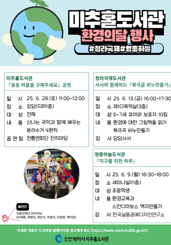 먼저 미추홀도서관은 6월 28일 강당에서 환경 국악극 ‘동동 마을을 구해 주세요’를 공연한다.
