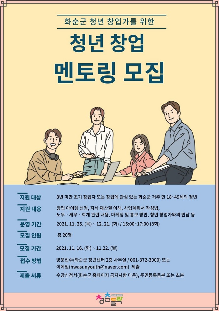 6강 이상을 수강한 수강생에게는 향후 청년센터 내 ‘청들 창업 lab’ 입주 가점 등 특전을 제공한다. 만 18세~ 49세의 초기 창업자 또는 창업에 관심 있는 화순군 청년이면 누구나 신청할 수 있다.