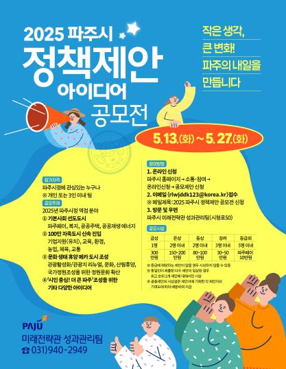 [세계로컬타임즈] 파주시가 ‘2025년 파주시 정책 제안 아이디어 공모전’을 5월 13일부터 27일까지 개최한다.