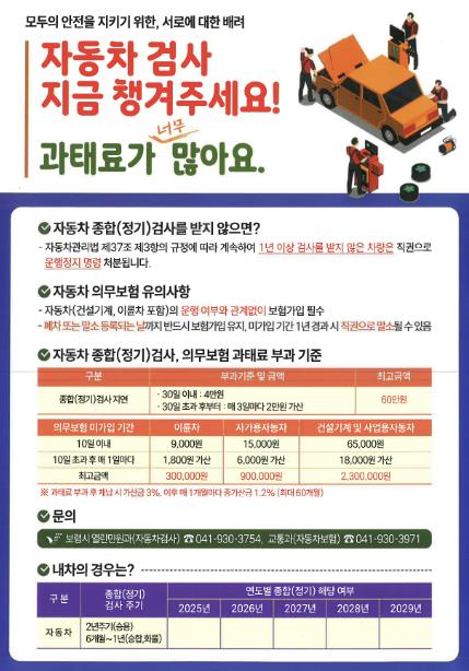 강춘아 열린민원과장은 “자동차 검사와 의무보험 가입은 선택이 아닌 필수임을 강조하며 읍면동별로 정기적인 사전 홍보와 안내를 통하여 안전한 교통문화 조성을 위해 노력하면서, 기간 경과로 인한 과태료 납부 부담을 줄이도록 최선을 다하겠다”고 말했다.