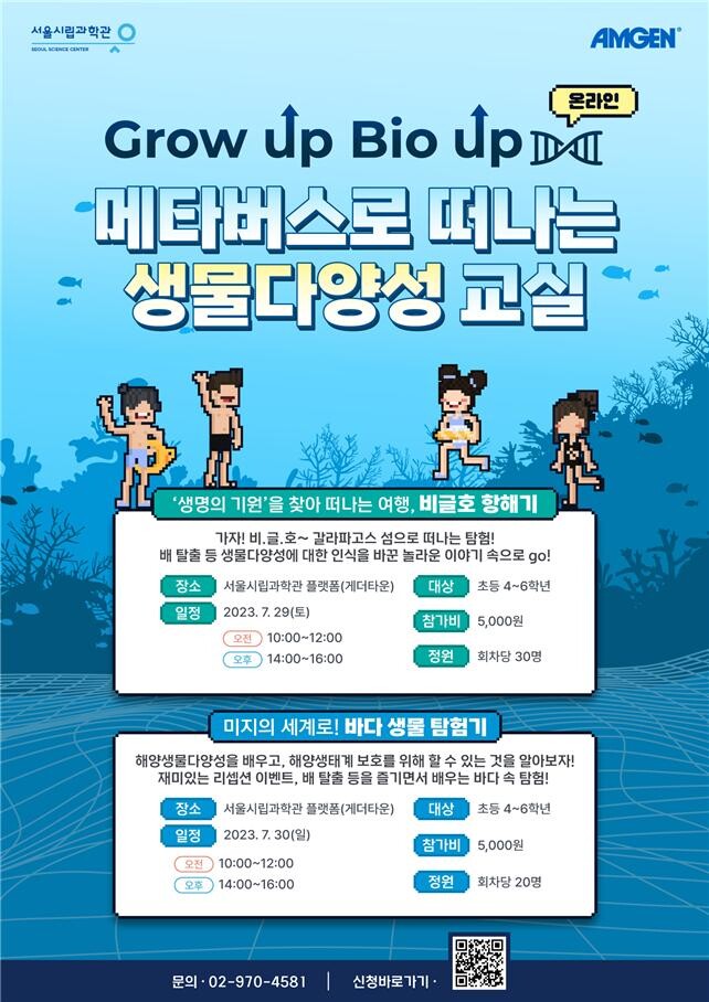 ‘그로우 업, 바이오 업(Grow up, Bio up)’은 ▴초등학교 4~6학년 대상으로 진행되는 ‘메타버스로 떠나는 생물다양성 교실’ ▴초등학교 4학년 이상 아동·청소년 및 가족을 대상으로 진행되는 ‘내 몸 어디까지 알고 있니?’ 과학실험교실로 구성돼 있다.