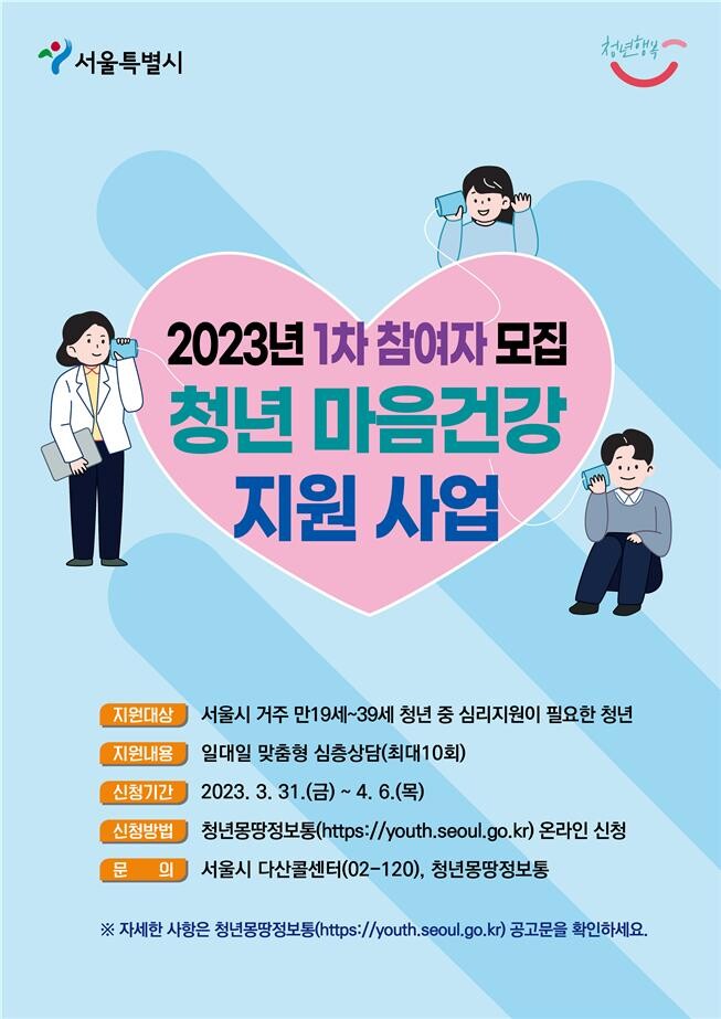 서울시는 올해부터 ‘청년 마음건강 지원사업’을 다각도로 고도화해, 마음근력 회복 프로그램을 받을 청년을 모집한다.