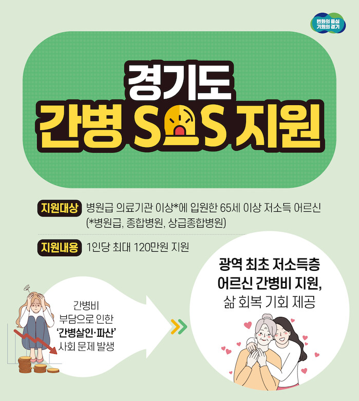 경기도 간병 SOS 지원 사업은 국가 간병지원체계 마련 촉구를 위한 시범사업이다. 경기도에 거주하는 저소득층 중 상해·질병 등으로 병원급 의료기관 이상에 입원해 간병서비스를 받은 65세 이상 노인이 지원 대상이다.