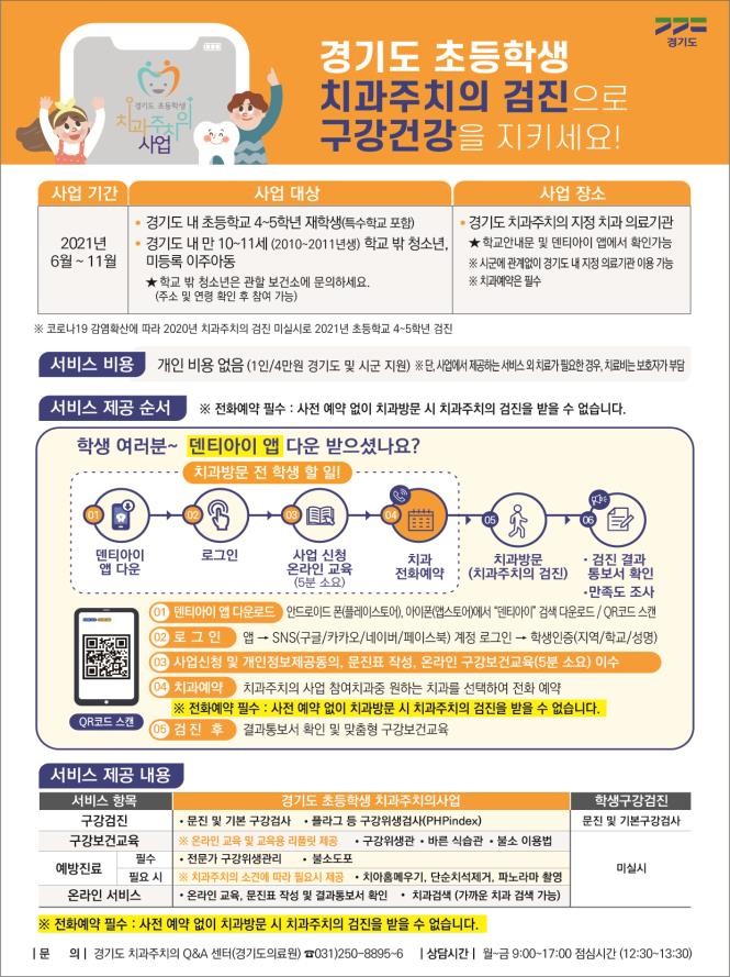 사업 대상 아동들은 6월 1일부터 11월 30일까지 경기도의 ‘덴티아이’ 앱을 내려받아 온라인 동영상 교육을 이수하고, 치과 예약 후 진료를 받으면 된다.