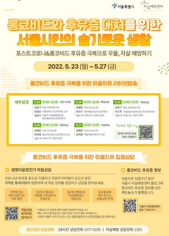 서울시자살예방센터는 ‘롱코비드 후유증 극복을 위한 마음치유 라이브방송’을 오늘(23일)부터 27일까지 10시~12시 유튜브 채널을 통해 실시간 운영한다. 시민 누구나 온라인으로 참여할 수 있다.