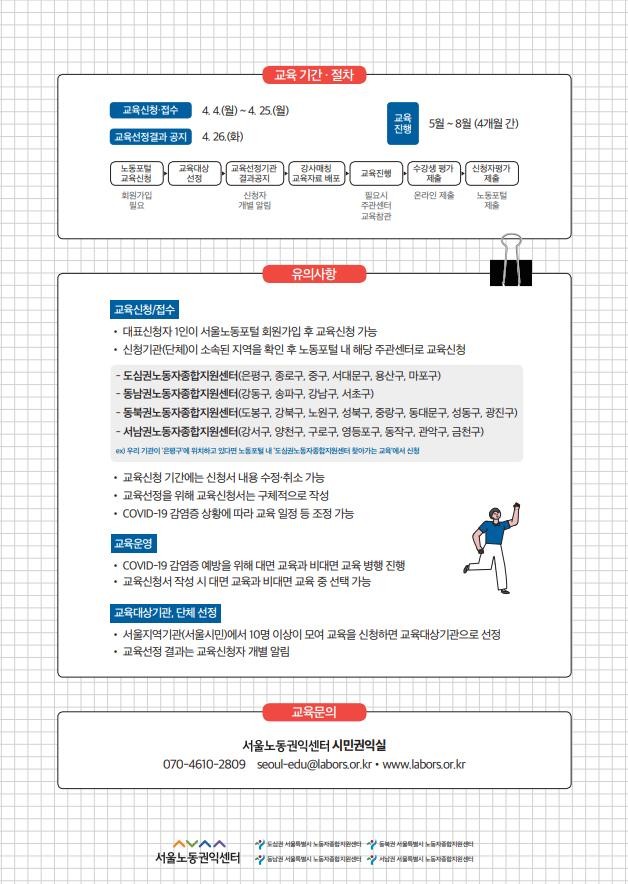 강사는 서울노동권익센터에서 위촉한 공인노무사 등 분야별 전문가들이다.