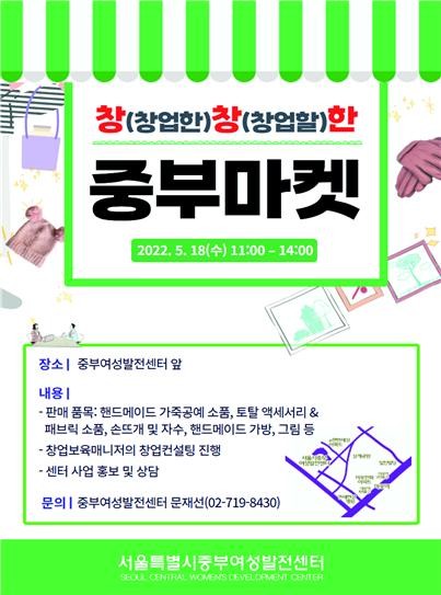 마포구 용강동 중부여성발전센터에서는 18일에 여성창업자 지원을 위한 ‘창창(創創)한 중부 마켓’을 개최한다. 창업을 준비 중인 교육생들이 핸드메이드 가죽공예, 액세서리 및 패브릭 소품, 가방, 자수, 그림 등을 선보이고, 창업에 관심 있는 여성들을 위한 창업컨설팅도 함께 진행된다.