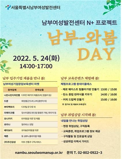 금천구 시흥동 남부여성발전센터에서는 지역주민들과 교육생이 참여하는 ‘남부-와봄 Day’ 행사를 오는 24일에 개최한다. ▴여성기업창업보육센터 입주기업(9개)의 프리마켓 ▴원데이 클래스(텀블러 가방, 드립백, 다육이화분 등 만들기 체험) ▴일자리상담으로 구성된다.