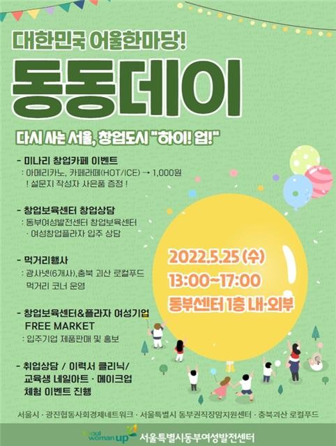 광진구 자양동 동부여성발전센터에서는 25일 코로나로 2년 넘게 사업에 어려움을 겪고 있는 여성기업의 제품 판매·홍보를 위해 ‘동동(同動)데이’를 개최한다. 이번 행사는 동부창업보육센터 여성기업(15개)을 포함 총 20개 업체가 참여하며, 교육생과 시민들이 함께 한다.