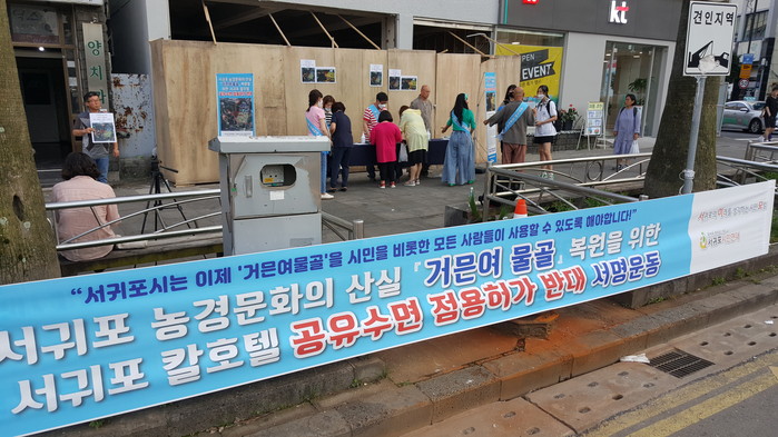[세계로컬타임즈 글·사진 김시훈 기자] 서귀포의 미래를 생각하는 시민모임 (일명 서미모)와 서귀포 시민연대(서시연)는 공유재산인 거문여 물골을 복원해 시민들에게 돌려줘야 한다는 서귀포 칼호텔 공유수면 점용허가 반대 서명운동을 진행했다.