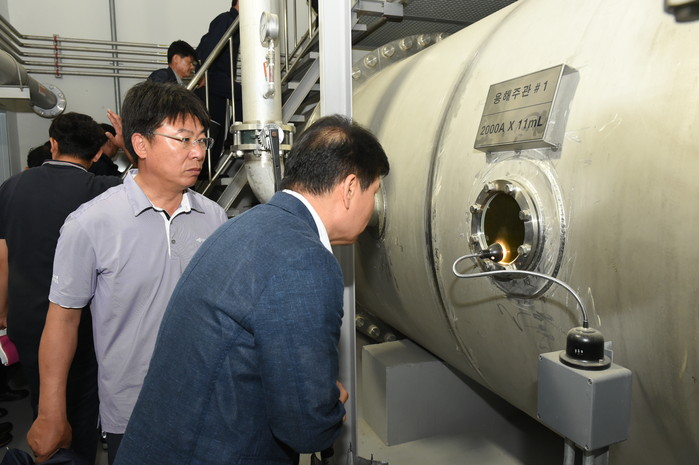 | ▲ 강북아리수정수센터를 방문한 상수도 관계자들이 오존투입 과정을 확인하고 있는 모습. |