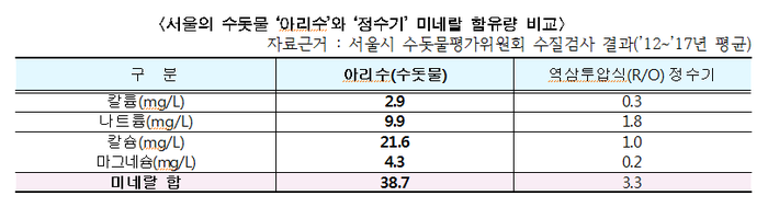 민간 전문가 등으로 구성된 서울시 수돗물평가위원회에서 2012년부터 2017년 상반기까지 수질검사를 한 결과 수돗물 ‘아리수’가 역삼투압식 정수기보다 미네랄 함유량이 월등히 높은 것으로 나타난 것이다.