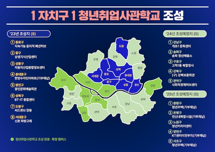 2025년은 중랑·노원(동북권), 양천(서남권), 은평(서북권), 서초(동남권) 등 총 5개소를 조성해 ‘1자치구 1청년취업사관학교 조성·운영’을 완수할 계획이다.