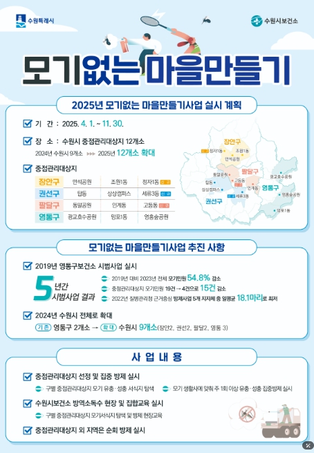수원시보건소는 시민들에게 야외 활동 시 모기 물림을 피할 수 있도록 ▲야간(일몰 직후~일출 직전) 외출 자제 ▲밝은색 긴 옷, 품이 넓은 옷 착용 ▲노출 피부·의류·신발 등에 모기 기피제 사용 ▲진한 향수나 화장품 사용 자제 ▲방충망 정비·모기장 사용 등을 권고했다.