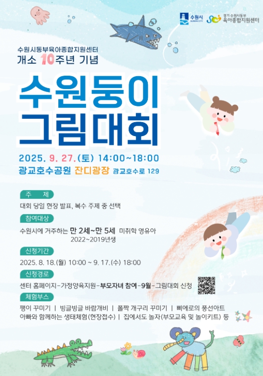 수원시동부육아종합지원센터 관계자는 “개소 10주년을 맞아 여는 이번 그림대회는 영유아와 가족이 함께 어울리고 소통하는 따뜻한 시간이 될 것”이라며 “지역사회와 함께하는 놀이 중심 프로그램을 지속해서 운영해 아이들의 건강한 성장과 발달을 적극적으로 지원하겠다”고 말했다.