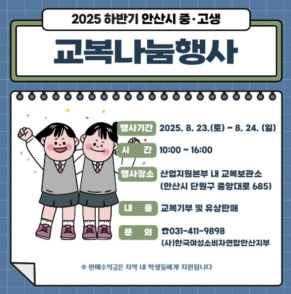 이번 행사는 안산소비자단체협의회가 주최하고 한국여성소비자연합 안산지부가 주관한 가운데 진행된다. 지역 내 중·고등학교 졸업생들의 교복을 기증받아 세탁과 분류 과정을 거친 뒤 저렴한 가격에 판매된다.