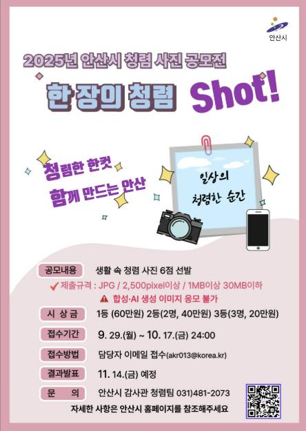 이번 공모전에서는 ‘청렴한 한 컷, 함께 만드는 청렴안산’을 주제로, 시민들이 일상에서 정직·배려·책임 등 청렴 가치를 실천한 내용이 담긴 사진을 공모한다.