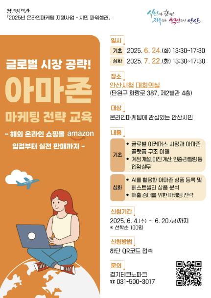 교육은 6월 24일 기초 과정, 7월 22일 심화 과정으로 나눠 안산시청 대회의실에서 진행된다. 기초 교육에서는 ▲글로벌 이커머스 시장 동향 및 아마존 플랫폼 구조 이해 ▲계정 개설, 마진 계산, 인증·라벨링 등 입점 실무를 다룬다. 심화 교육에서는 ▲AI를 활용한 아마존 상품 등록 및 베스트셀러 상품 분석 ▲매출 향상을 위한 실전 마케팅 전략을 소개할 예정이다.