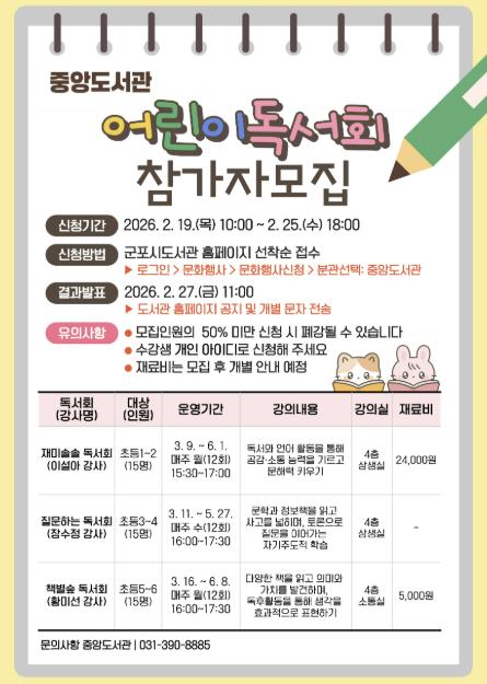 독서회별 참여 인원은 선착순 15명으로, 2026년 2월 19일 10시부터 군포시도서관 누리집을 통해 신청할 수 있다.