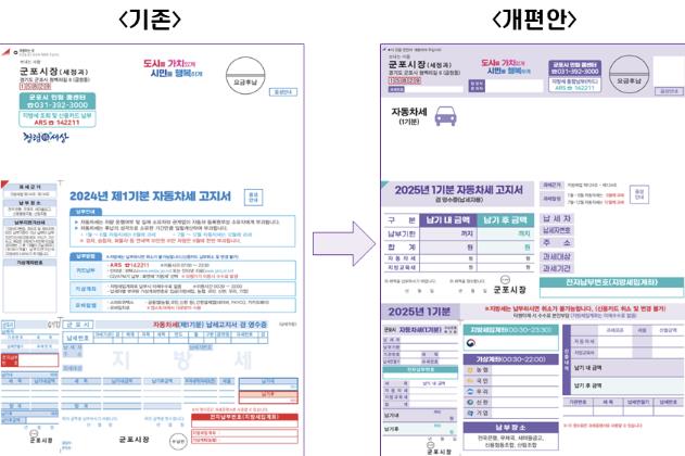 군포시는 이번 개편을 통해 고지서 이해도를 높이고 납세 편의성을 향상하는 것은 물론 행정 효율성 및 신뢰도를 강화할 것으로 기대한다. 6월 자동차세 납부고지서를 시작으로 재산세, 주민세, 등록면허세 등 정기분 및 독촉분 고지서에도 적용할 예정이다.