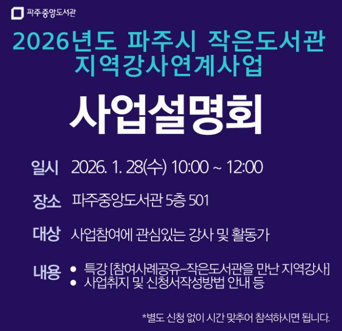 오는 28일 10시 중앙도서관에서 참여하고자 하는 강사들을 위해 모집 전 ‘강사 사업설명회’를 개최한다. 설명회에서는 사업 취지와 신청서 작성방법 등을 설명하여, 지역 작가, 예술가, 독서문화 등 다양한 역량을 가진 강사가 참여할 수 있도록 안내할 예정이다.