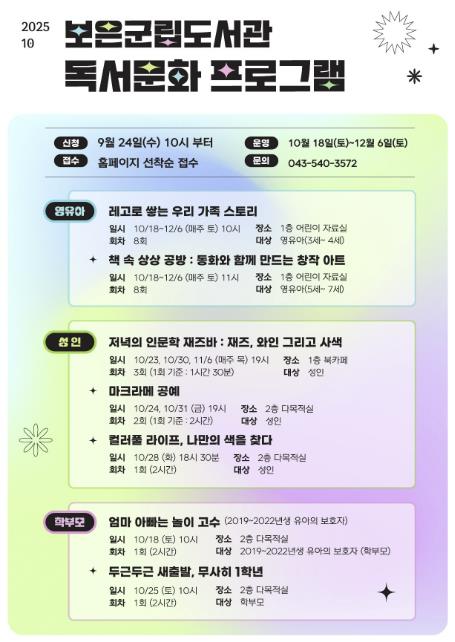 이미화 군 행복누리팀장은 “지역 주민의 생애주기별 학습 기회를 확대하기 위해 다양한 교육 프로그램을 마련했다”며 “앞으로도 도서관이 주민의 문화·교육 플랫폼으로 자리매김할 수 있도록 꾸준히 노력하겠다”고 밝혔다.