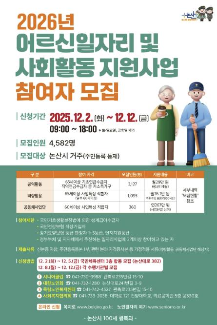 논산시 관계자는 “어르신 일자리 참여는 건강과 소득 안정뿐 아니라 삶의 활력 증진에도 큰 도움이 된다”며 “어르신들이 행복한 노후를 누릴 수 있도록 사업 운영에 최선을 다하겠다”고 말했다.