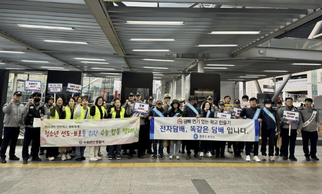 수원역 인근 피시(PC)방, 호프집 등 청소년 취약 시설을 방문해 술·담배 판매 금지를 안내하고, 점검을 병행했다. 또 흡연금지구역에서 담배를 피우는 이들을 계도하고, 담배꽁초 줍기 등 환경정비 활동도 했다.