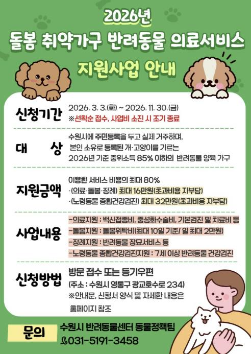지원 대상은 수원시에 주민등록을 두고 실제 거주하며 본인 명의로 반려동물을 등록해 기르는 기준중위소득 85% 이하 가구다. 저소득층, 중증장애인, 한부모가정, 다문화가정, 1인가구 등이 포함된다. 경기도 공공입양기관에서 국가봉사동물을 입양한 경우는 소득과 관계없이 지원한다.