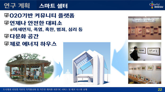 ‘스마트 쉘터’는 우리나라의 전통 쉼터인 정자에서 착안한 것으로 미세먼지 · 폭염 · 혹한 · 범죄 등을 피하는 대피소와 다양한 문화콘텐츠를 관람하는 다문화 공간, 심리상담 공간 등 다방면으로 활용할 수 있는 시설물이다.