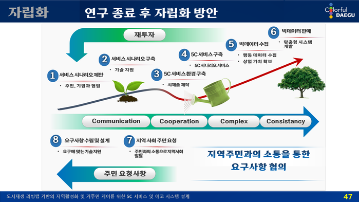 | ▲ ‘O2O(Online to offline) 기반 시민 케어 및 다문화 커뮤니티 서비스 구축을 위한 리빙랩’ 연구 종료 후 자립화 방안.(자료=대구시 제공) |