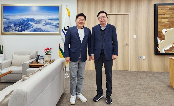 이어 제주특별자치도청을 방문한 윤 시장은 오영훈 도지사에게 신재생에너지 잉여 전력을 활용한 그린수소 생산·보관·이송과 관련해 한국에너지공과대학교와 연계한 양 도시 간 상생 협력을 제안했다.