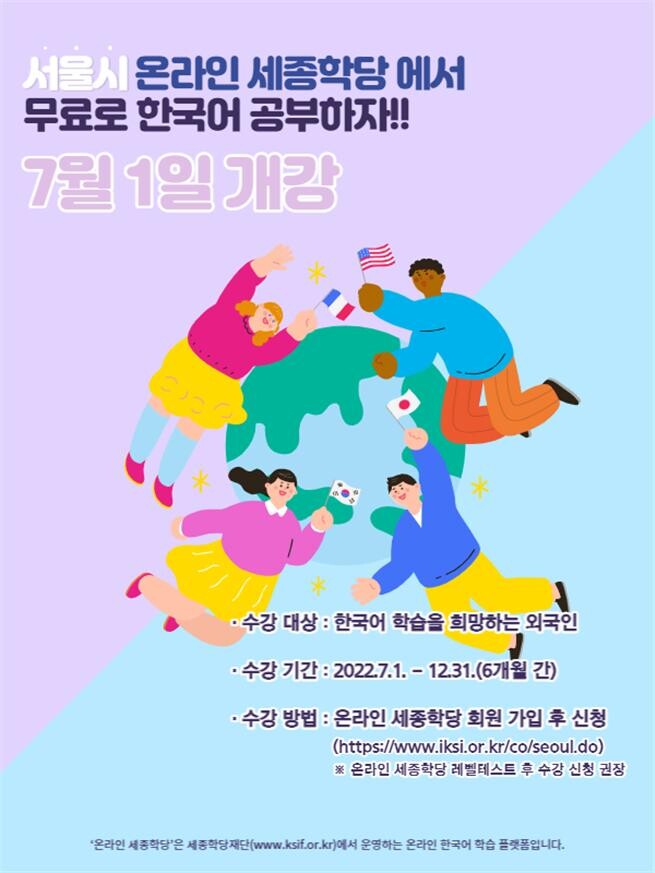 [세계로컬타임즈 이효진 기자] 서울시는 오는 7월 1일부터 서울 거주 외국인주민(44만명) 및 이주 희망 외국인을 위한 무료 온라인 한국어 학습 플랫폼 ‘서울시 온라인세종학당’을 6개월간 시범운영한다.