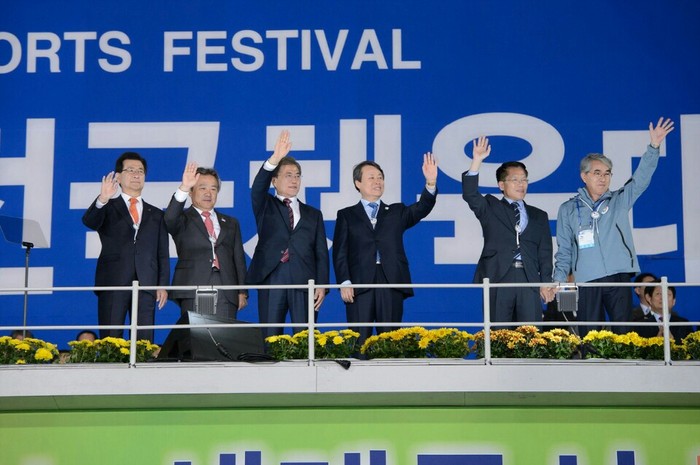 | ▲ 문재인 대통령과 함께 단상에 오른 한경호 권한대행과 박종훈 교육감이 손을 잡고 경남선수단을 격려하고 있다. 왼쪽부터 이시종 충북도지사, 이기흥 대한체육회장, 문재인 대통령, 도종환 문화체육부장관, 한경호 경남도지사 권한대행, 박종훈 경남도교육감.<사진제공=경남도청> |