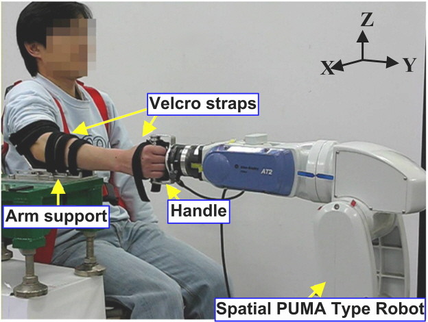 | ▲ dIMBIC 기반 기법이 적용된 로봇으로 손목과 아래팔의 경직도를 측정하는 장면.<사진제공=울산과기원> |