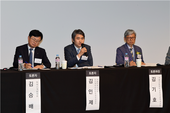 | ▲ 김인제 서울시의원(중앙)이 서울시 타운매니지먼트 국제 심포지엄에서 발표하고 있다. <사진제공=서울시의회> |