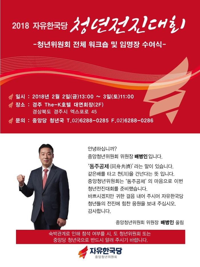 중청위는 오는 2월 2일 경북 경주시 더 케이(The-K) 호텔 2층 대연회장에서 '2018 자유한국당 청년전진대회'를 개최한다.