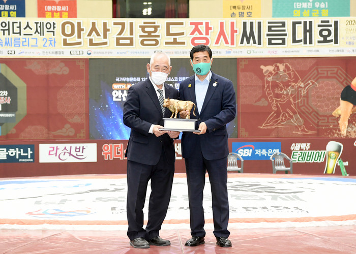 | ▲ 김홍도장사씨름대회 대회장(좌)과 윤화섭 안산시장이 씨름장에서 기념 촬영을 하고 있다.(사진=안산시) |