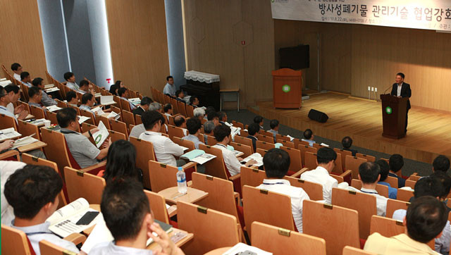 | ▲ 한국원자력환경공단이 지난 22일 경주 신사옥에서 산·학·연 전문가 등 100여명이 참석한 가운데 방사성폐기물 관리기술 협업강화 워크숍을 진행하고 있다.<사진제공=한국원자력환경공단> |