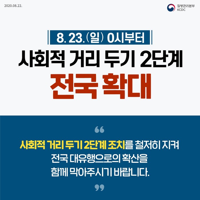 | ▲사회적 거리두기 2단계 전국확대 홍보물. (자료=질병관리본부 제공) |