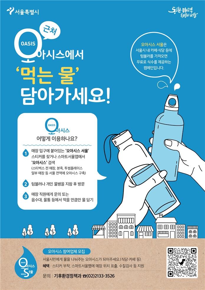 [세계로컬타임즈 이효진 기자] 서울시가 카페‧식당 등에 텀블러(개인 컵)나 개인 물병을 가져오는 시민에 무료로 식수를 제공하는 ‘오아시스 서울’ 사업을 주민센터, 관공서, 은행, 서점 등으로 확대한다.